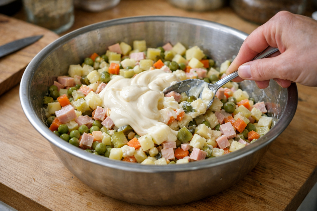 Якщо ви готуєте вперше, тоді оливье рецептт потрібно виконувати уважно та послідовно. Спочатку підготуйте всі інгредієнти, адже так процес буде швидшим. Далі варіть овочі приблизно 20–25 хвилин, поки вони стануть м’якими, але не розвареними. Потім обов’язково дайте продуктам повністю охолонути, бо теплі інгредієнти можуть зіпсувати смак майонезу. Після цього нарізайте кубиками розміром близько одного сантиметра. Згодом злийте рідину з горошку та додайте його до інших продуктів. На завершення приправте сіллю та перцем за смаком.